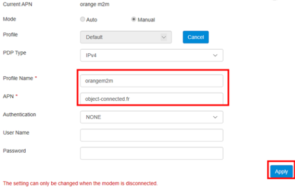 - Type in the Profile Name and APN, then click on ‘Apply’ and then ‘Set as default’ after the page updates.