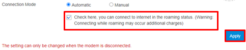 - At the next screen, tick the checkbox and ensure connection mode is “Automatic”. Tick the checkbox to enable roaming.