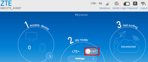 Once done, click the Apply button, then once again click the ZTE logo in the top left corner. - At the dashboard, click the ‘Off/On button’ to activate data.