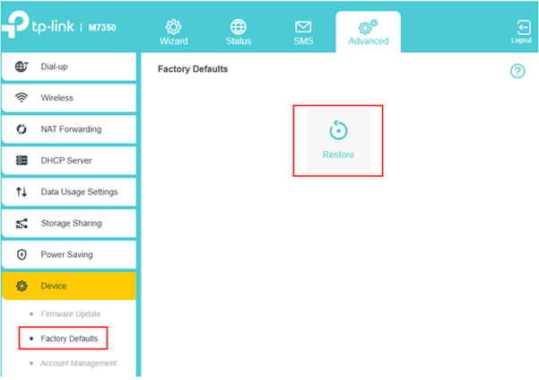 - Navigate to Advanced > Device > Factory Defaults and then click restore.
